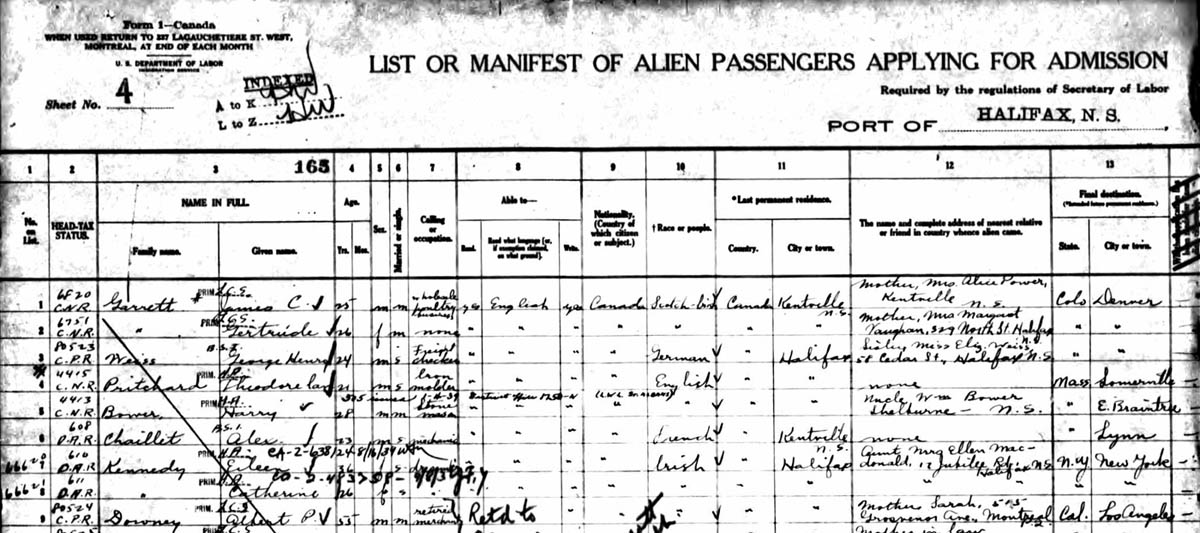 Manifest of Application for Admission - Port of Halifax, Nova Scotia, Canada- November, 1919