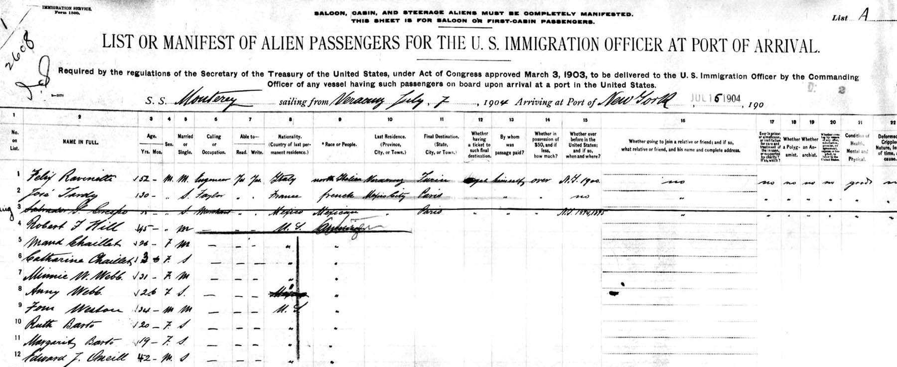 S. S. Monterey Manifest - July, 1904